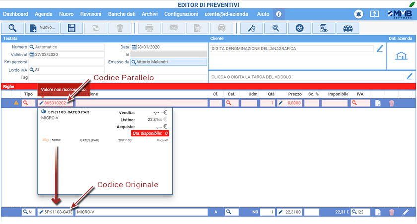 È stata risolta l’anomalia che impediva di inserire un articolo, proveniente dalla banca dati ricambi, in un documento (preventivo, ordine di lavoro, documento fiscale, ecc..) se la ricerca avveniva tramite un codice parallelo. Dopo aver inserito il codice parallelo nel campo “articolo”, veniva visualizzato il risultato corretto ma non era possibile inserirlo nel documento.